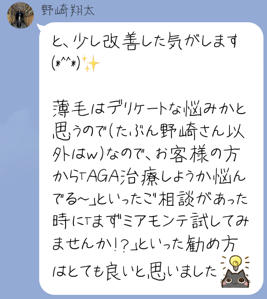 私たちの髪は常に生え変わっています。1日80〜100本程度の抜け毛は普通なので神経質になりすぎないで。刺激を与えなくてもハラハラ抜ける、朝起きると枕に大量についている、などがあり、毎日300〜400本抜けると危険領域です」髪のボリュームロスは、1本1本が細くなり、ハリやコシが低下して根元が潰れてしまう、という前段階があり、その延長線上に、抜け毛や薄毛があります。治すことはできませんがエイジングケアしていきましょう。気になった方はMINGLEで、最近自信を付けた野崎さんの後頭部興味のある方は、是非見に来て下さい(笑い